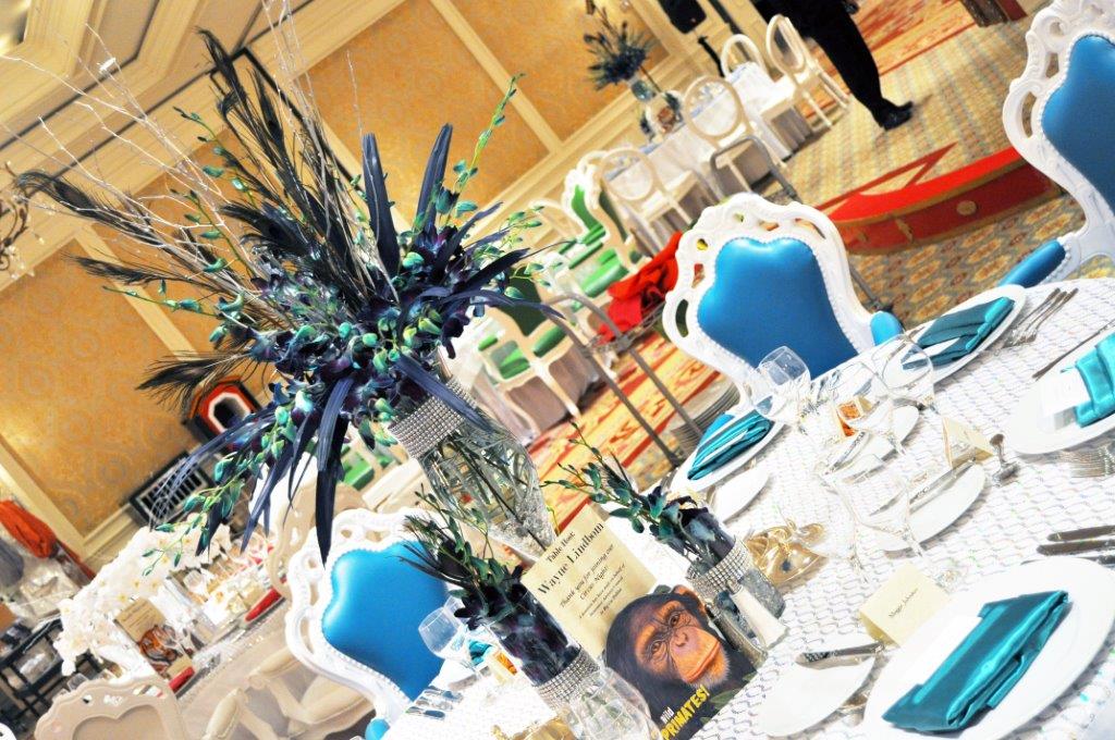 The main event was a gala held in the evening. The gala was a sophisticated circus theme. Each of the arrangements were designed to match the chairs, which included the colors of pink, red, blue, green, white, and black. In true Beneva fashion, our designers wanted something very unique and memorable. The designs were inspired by various items that you would find at a circus. The pink feathers are similar to ones that might be found on a dancer’s costume. The calla lily design resembles a tightrope.