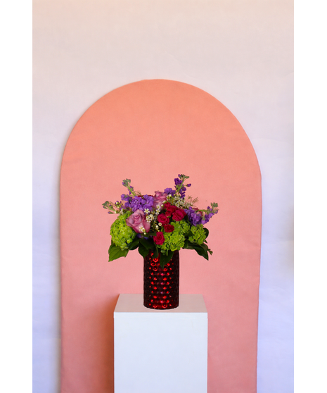 Introducing the Mother Nature floral arrangement, a stunning mix of blooms that come together beautifully. This arrangement includes a pink diamond cut vase, a majestic white aster, mini green hydrangeas, dark purple stock blooms, moody blue roses, hot pink spray roses, and salal leaves. It's a perfect way to bring nature's beauty into any space, and it makes a thoughtful and heartfelt gift.