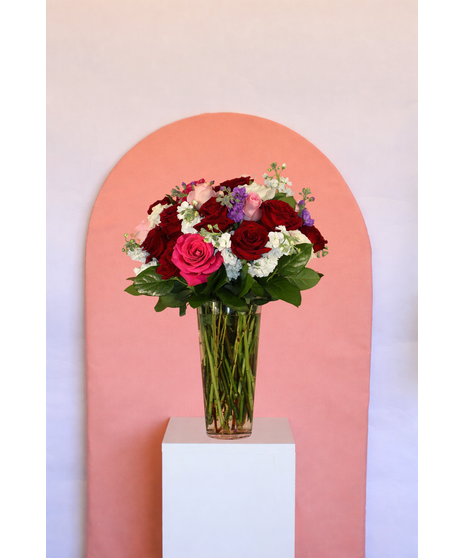 Allow me to present to you The Queen, a floral arrangement that will make you feel like royalty. This stunning arrangement comes in a captivating purple glass vase and features a captivating mix of Red Roses, Assorted Roses, Dark Purple Stocks, Hot pink Stocks, and Green Salal.