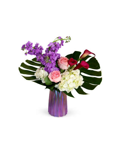 Violet Embrace is a striking, modern arrangement designed for those drawn to bold florals with a refined edge. Featuring sculptural calla lilies, richly hued purple stock, and dramatic monstera leaves, this design balances tropical influence with elevated sophistication. Styled in a stunning purse vase, Violet Embrace feels confident, contemporary, and artfully composed. Clean lines meet lush textures, creating a look that’s unexpected yet polished, perfect for making a statement without sacrificing elegance.